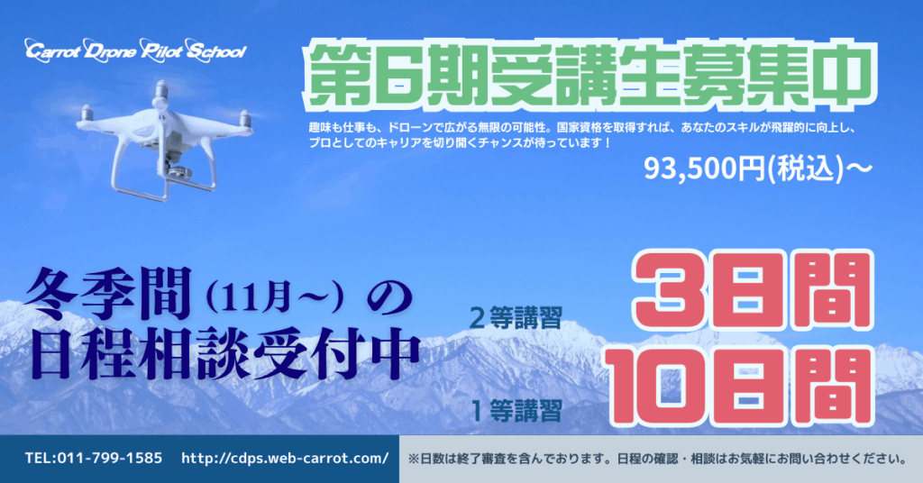 国家資格対応の札幌街ナカ ドローンスクール「キャロット ドローン パイロット スクール」ですが、第6期の募集も開始いたしました。